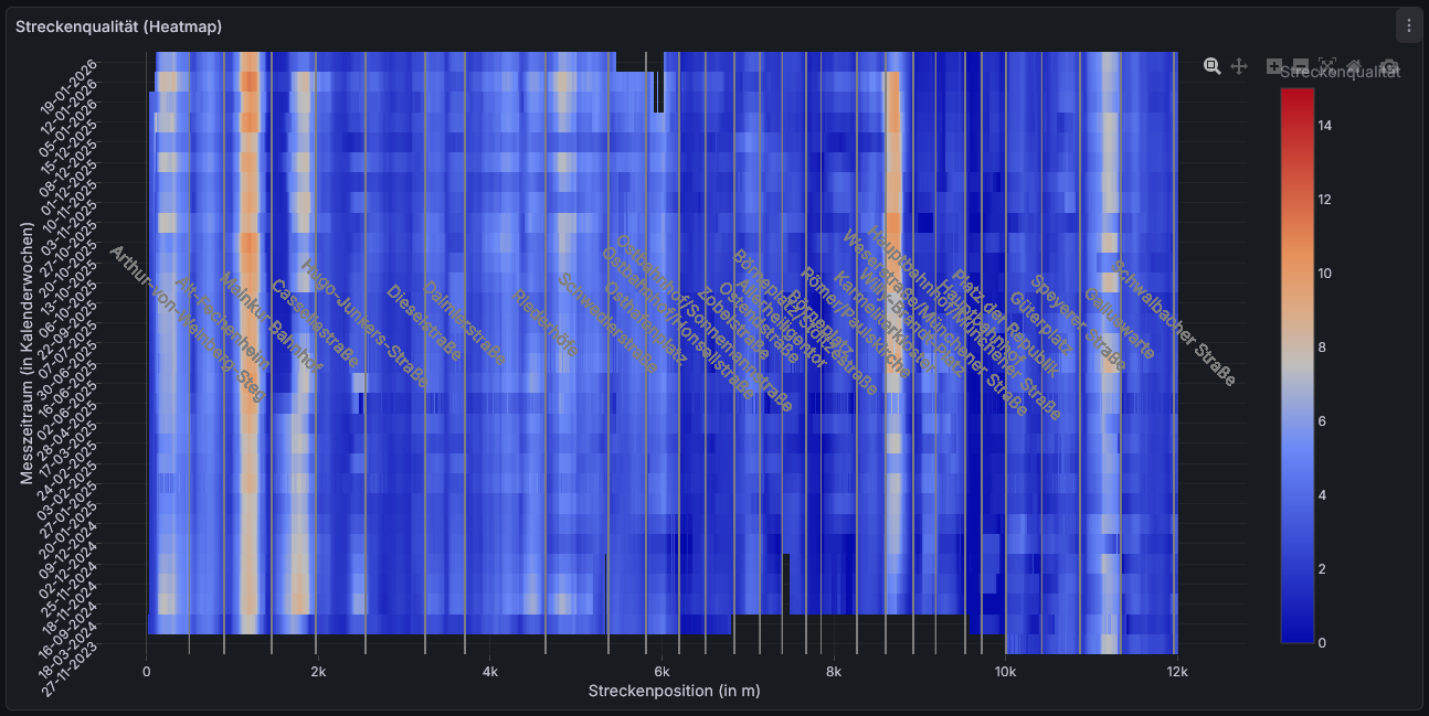Im Dashboard stehen einzelne Seiten zu Häufigkeit der Messungen, Analyse der rohen Messwerte von Einzelmessungen (Abb. 1) und Ergebnisdarstellungen zum Längshöhenfehler zur Verfügung. Das Dashboard auf Basis der Open-Source-Anwendung Grafana ermöglicht die grafische Analyse der Messungen aus den im VGF-Netz verkehrenden Straßen- und Stadtbahnen.